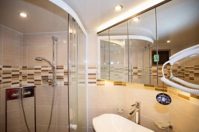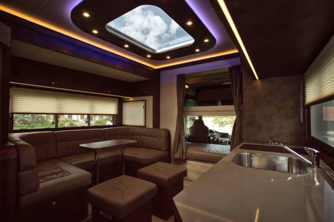The owner’s accommodation, as you might expect, has the appearance of a luxury apartment – with sumptuous leather upholstery adorning cleverly-designed seating – all of which can be built according to the owner’s specification. Together with a range of luxurious entertainment appliances …it really feels like a home-from-home: accommodating six or seven, beds automatically lift-out when needed; bedrooms feature en-suite toilets. The kitchen has all the fitted appliances you would expect: including ceramic hob, fridge freezer and micro-wave – for those whose second hobby is creating haute cuisine.