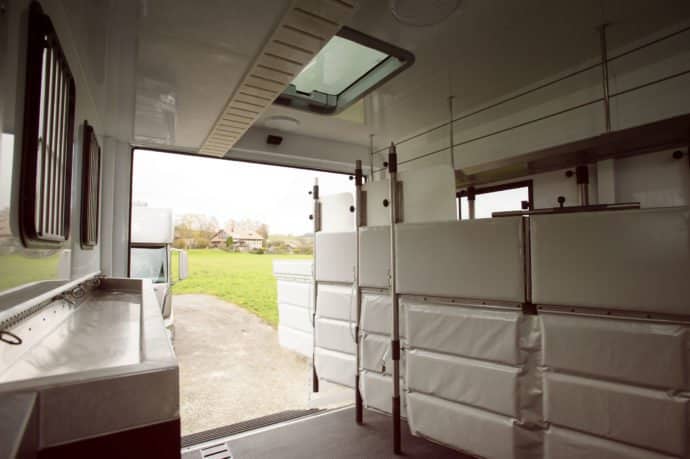 The accommodation for up to six horses air conditioned – and they can be video-monitored day and night thanks to the stabling’s dual day/night-lighting systems. The box includes storage for tack, feed, and health products – together with a horse shower and box hose-down facility. And to help overcome the fear of ‘loading’ which is quite common in horses – the ramps (situated to the vehicle’s side and rear) are of solid no-slip design, and incorporate aluminium barriers on either side of the gangway.