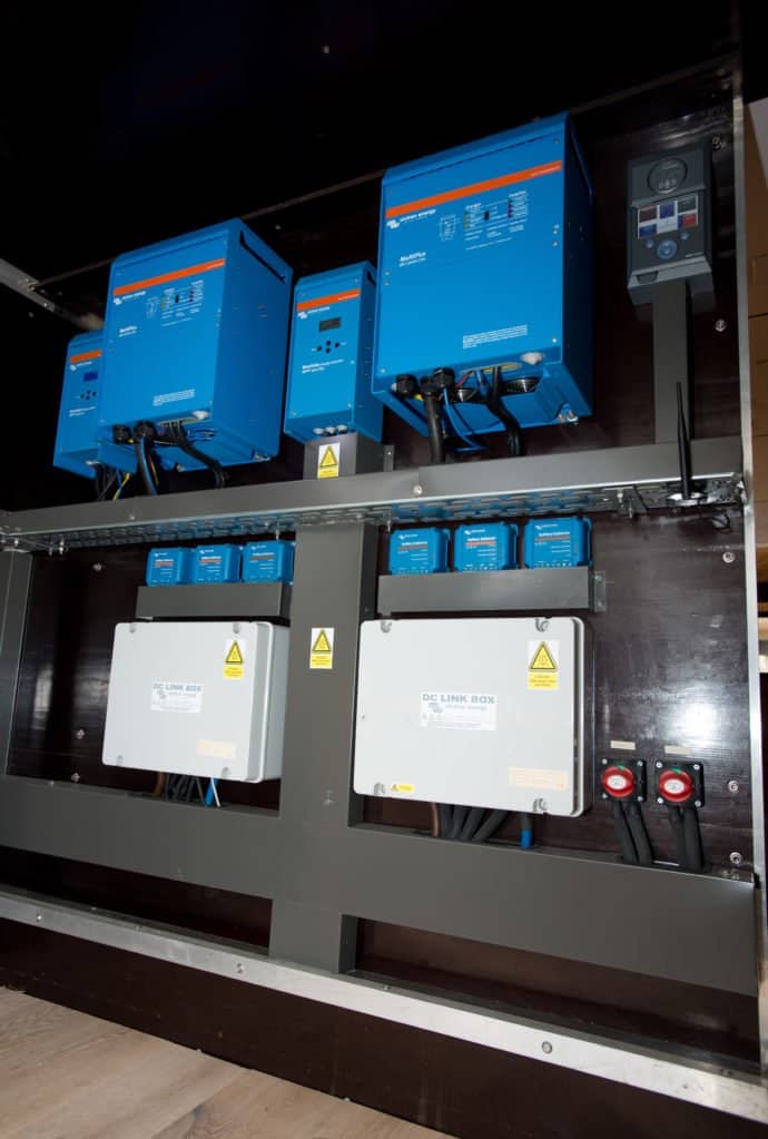The installation provides a maximum 40A AC via 12 separate outlets – or up to 200A with an external power supply. Révolusun also offers 2 external chests with P32, P17 and conventional jacks. Whilst working on site the truck is provided with a full-time engineer – plus, of course, the system can be monitored on a mobile phone via the VictronConnect app. At the heart of the system is the communication gateway – the Color Control GX – which together with the battery monitor provides real-time dynamic control and data: