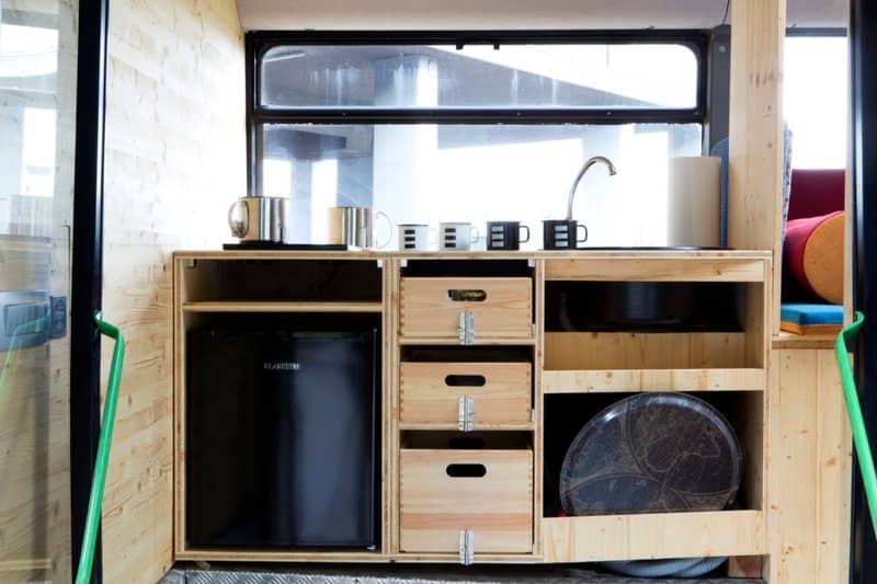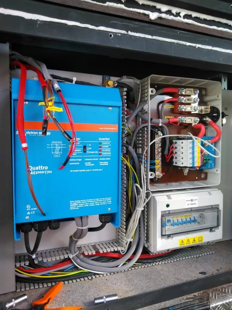 With all electrical work carried out by installer Elektro-Stumpfl the bus has Lighting, refrigeration, the kettle and re-charge points, using a Victron Quattro. The Quattro was chosen because it can accept power from two AC sources – this allows the bus to plug in to the mains electricity where it’s available, or a generator, or both. The Quattro takes power from whichever source is active and will ensure an uninterrupted power supply from the battery bank if external power should fail.