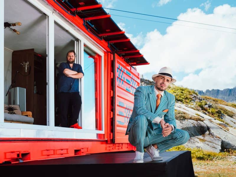 Dodo and Big J outside the Ministry of Good Vibes on location in the Grimsel Pass
