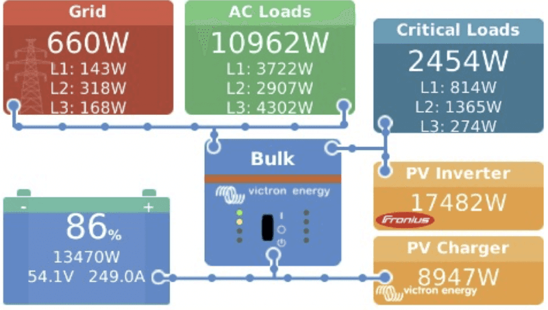 Basil Reekie has an unusual hobby: he is a remarkably capable home automation engineer. He has used the Control4 automation system in his homes for several years – configuring over 200 add-on drivers to the base Control4 platform. In collaboration with Warwick Chapman from Sensible Solar and Matthew Walsh from Tech Up Consulting (both Victron Authorised Installers), the team used a Modbus TCP driver for Control4 to read the current battery SoC from the Victron system – based on that information, and whether power hungry equipment (e.g. the sauna and steam room) are currently turned on, it adjusts the grid set-point. This configuration allows Basil’s system to automatically adjust these values based on the power requirements of the house; available battery power; and whether the Reekie’s are at home. When in Residence they’re able to maintain the SoC between 60% and 90% quite comfortably – despite peak electrical usage of up to 130A – while ensuring that the draw on the grid never gets too close to 80A per phase. In the extremely unlikely event of the SoC dropping too close to the chosen minimum SoC (40%), Control4 also turns off non-essential high power utilising equipment such as Pool Heaters and less important Air-Conditioning Zones.