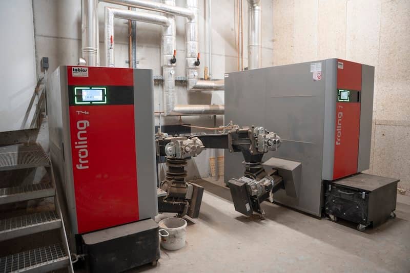 Heat for residential buildings, cheese production, and, when needed, hay drying is provided by a 350 kW wood chip heating system fueled by wood from the farm’s own forest—an efficient closed-loop system that fits perfectly with the farm’s sustainable philosophy.