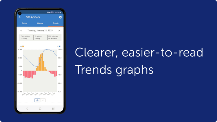 Trends data is now clearer and more detailed, making it easier to see how your system has been performing over time. Updated graphs are easier to read and interpret, while also giving access to deeper system information, helping build a clearer picture of energy production, consumption, and battery behaviour. Trends data is now also included when exporting product settings, making it easier to keep records or share data for support or analysis. This feature is available for all products that support stored Trends.